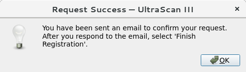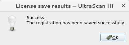 A 1 year license for the free use of UltraScan is now associated with the user's e-mail address, and a dialog should indicate the success of this step: