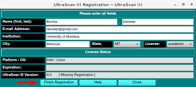 After confirming your UltraScan registration by clicking on the link in the email that was sent, the last step is to click on "Finish Registration" (red arrow) to confirm receipt of the license. If the registration was successful, you can finish the registration process by clicking on "Finish Registration" (red arrow):