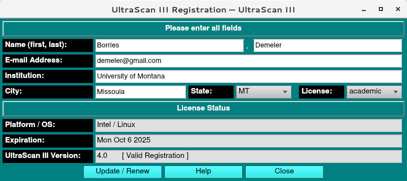 The "Update/Renew" button can be clicked at any time to add another year to the licensed use of UltraScan.